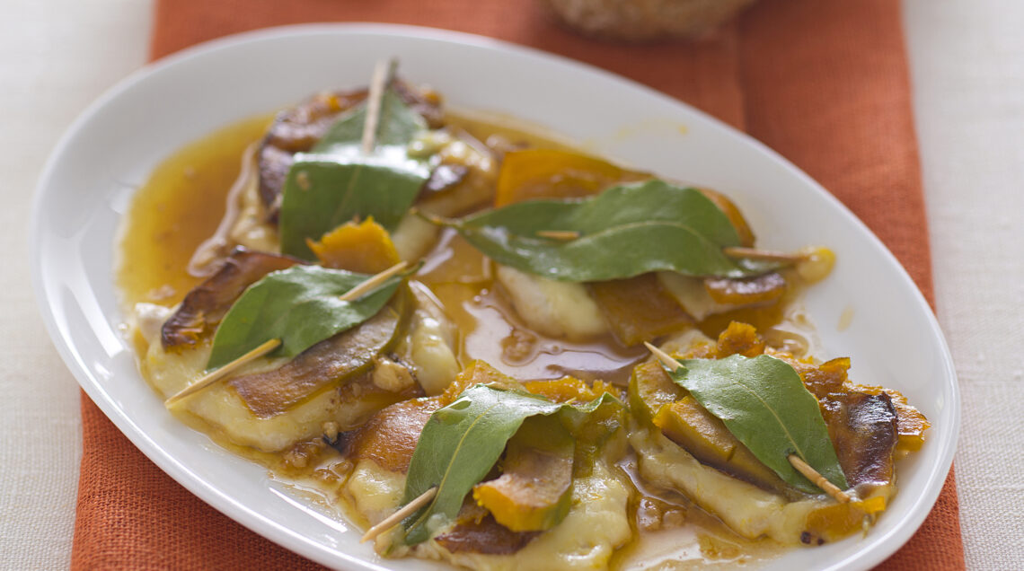 2  Sistemate 8 fettine di petto di pollo fra 2 fogli di carta da forno, appiattitele con un batticarne, poi dividetele in piccole scaloppe. Adagiate su ciascuna 1 fettina di formaggio tipo olandese, 1 fettine di zucca al miele e 1 foglia di alloro, poi fissate tutto con stecchini di legno.