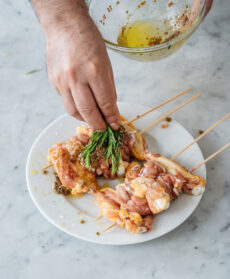 Scolate gli spiedini dalla marinata e cuoceteli sulla piastra ben calda (200°) o sulla brace. Salate e servite.