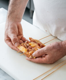 Ricavate la polpa dai fuselli e tagliate le ali in tre parti. Infilzate i pezzetti di polpa su spiedini di legno, alternandoli con le parti delle ali e salate.