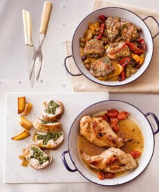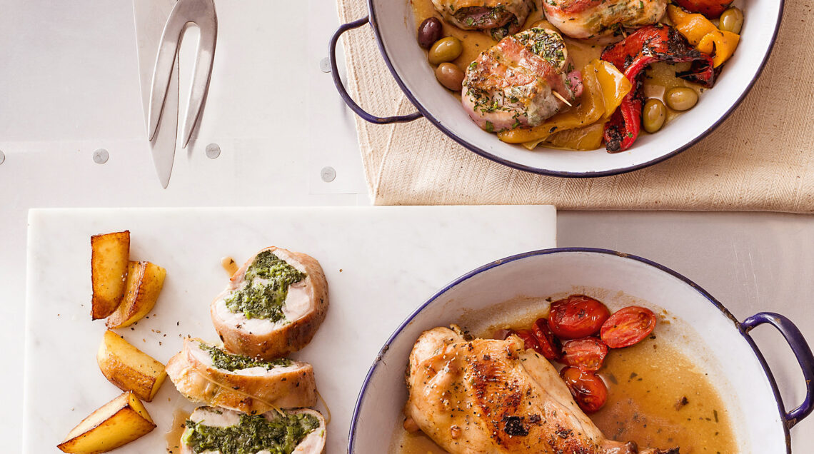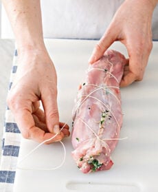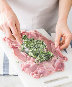 Arrotolalo, legalo con più giri di spago, poi rosolalo in una casseruola con 50 g di burro; salalo, spruzzalo di vino bianco e lascialo evaporare, unisci 2 grosse patate tagliate a spicchi e continua la cottura in forno a 180° per circa 1 ora.