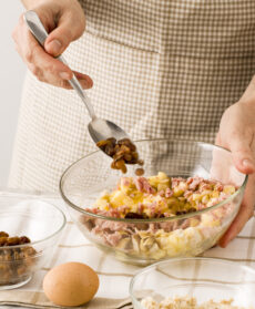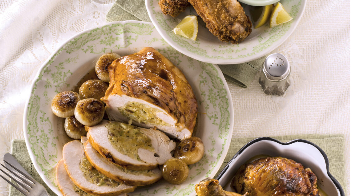 Mescola 200 g di castagne bollite e spezzettate, una mela a dadini, 1 cucchiaio di uvetta, 100 g di prosciutto di Praga tritato, una manciata di pane ammorbidito nel latte e di parmigiano grattugiato, 1 uovo, sale e pepe. Introduci il ripieno in 2 cosce di tacchino disossate e cuci l'apertura.