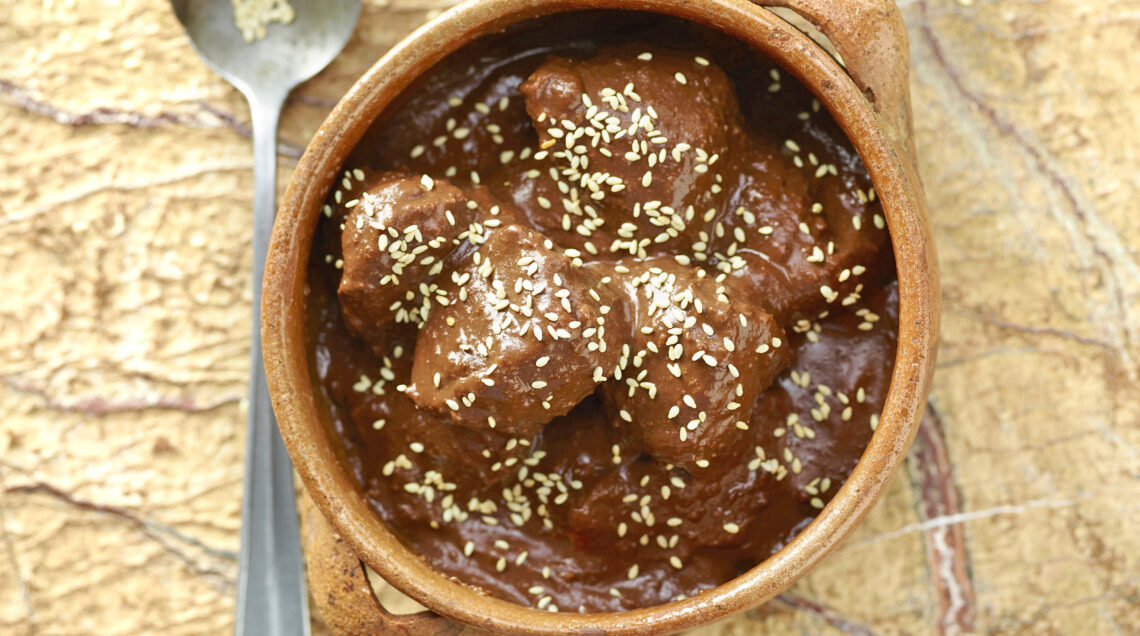 6) Sistema la carne in un piatto, versavi la salsa al cioccolato, spolverizza, se ti piace, con semi di sesamo.