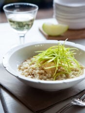 1 Pelate la metà delle pere, tagliatele a dadini e rosolatele con la metà del burro, lo spicchio d'aglio schiacciato, un pizzico di sale e un paio di bacche di ginepro pestate. Fate insaporire per qualche istante e togliete dal fuoco prima che le pere si ammorbidiscano troppo; profumatele con lo zenzero ed eliminate l'aglio.