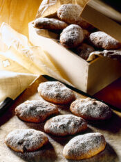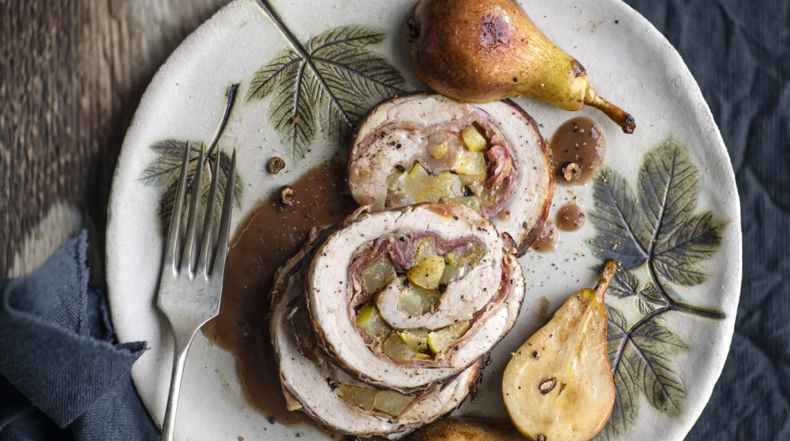 Una spruzzata di grappa alle pere profuma la fesa farcita di frutta al ginepro e pancetta. Il fondo di cottura si fa cremoso con un ricciolo di burro e regala alla carne un sapore unico