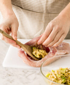 Incidi a tasca mezzo petto di tacchino (700-800 g), farciscilo con il composto e cuci l'apertura. Rosola la carne in una casseruola con 50 g di burro, sala, pepa e bagna con 1/2 dl di vino; lascia evaporare e cuoci per 1 ora e 15 minuti.