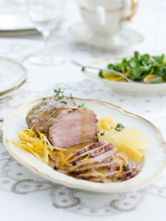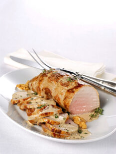 Filetto bardato con salsa alla carbonara e cipollotti al miele