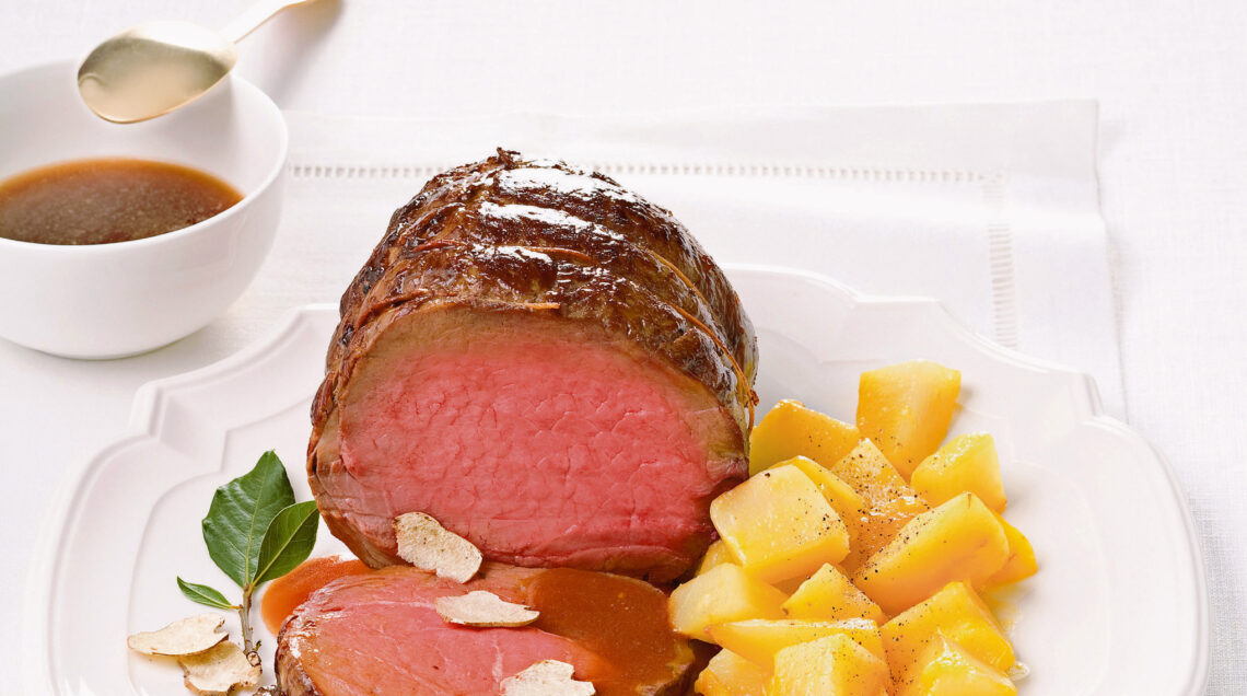 5) Servi il tuo arrosto di bue a fettine, accompagnato dalle patate e guarnito con scagliette del tartufo rimasto e con qualche cucchiaiata della salsina ricavata dal fondo di cottura.