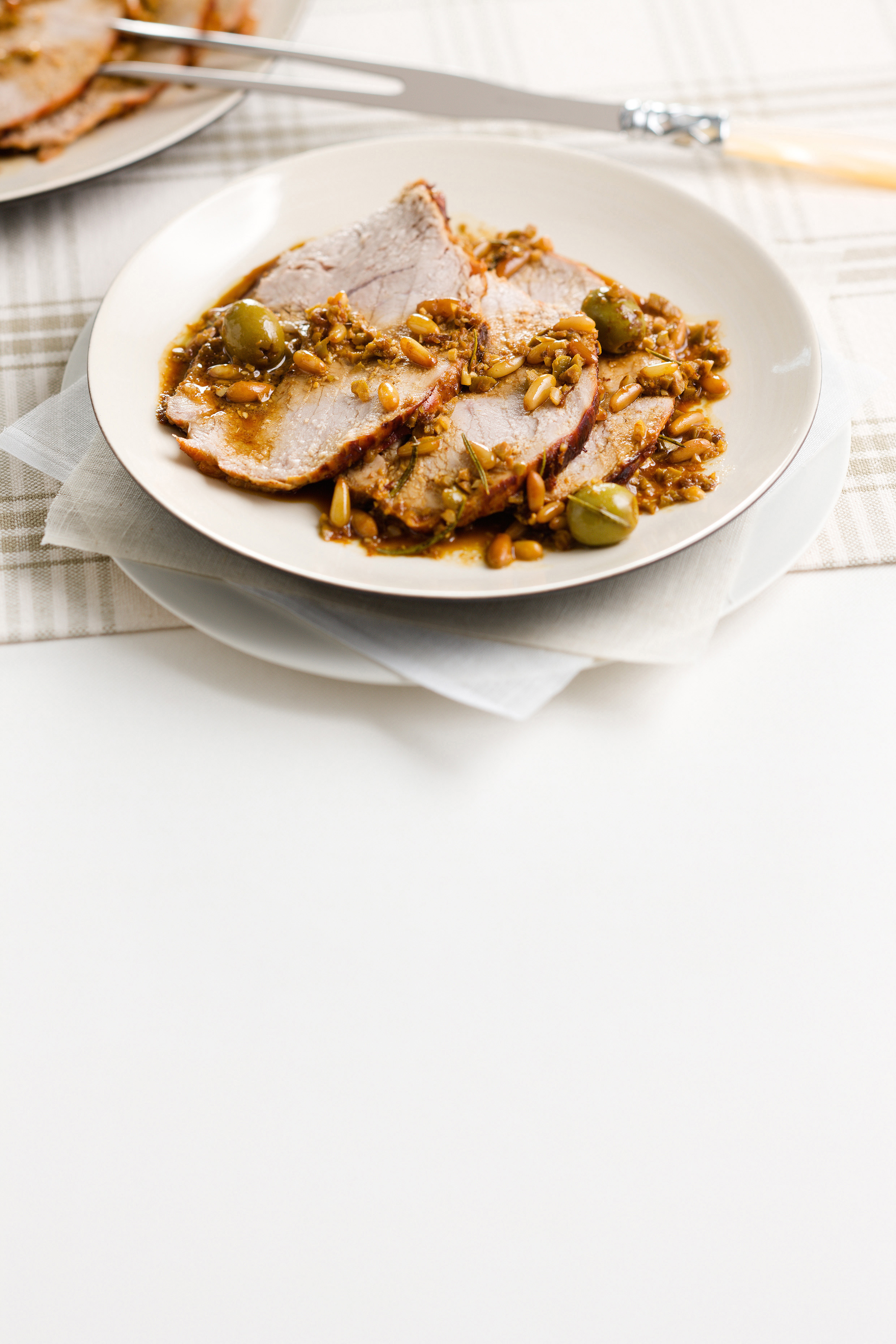 3) Ultimata la cottura, il tuo arrosto in salsa di olive verdi, pinoli e acciughe è quasi pronto: elimina il rosmarino e fallo riposare per 10 minuti. Taglialo in fette di 4/5 millimetri e appoggiale su un piatto da portata.