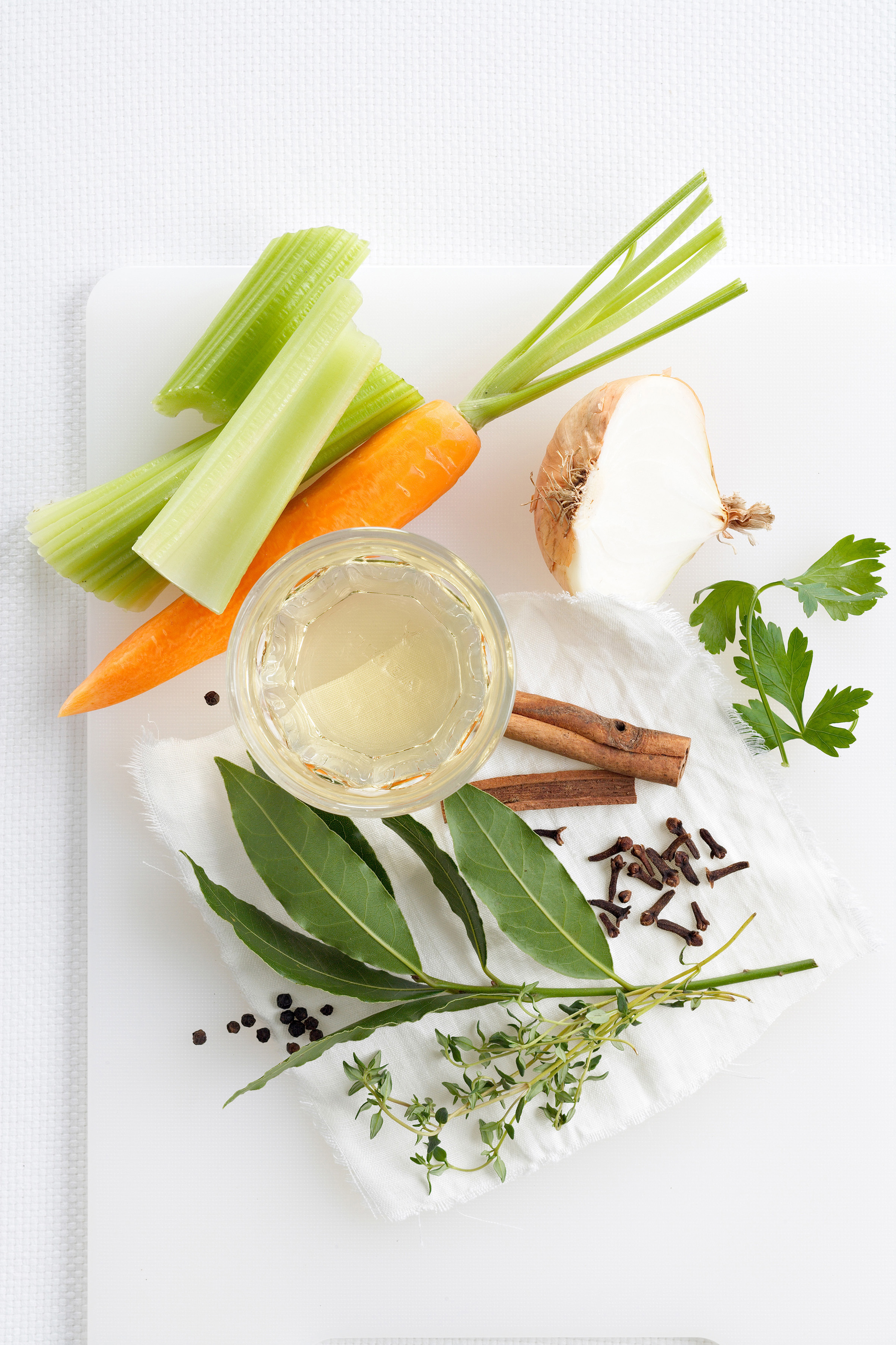 1) Prepara il vino aromatizzato mettendolo a bollire con un sacchetto di garza contenente prezzemolo, timo, le foglie di alloro, la stecca di cannella, i chiodi di garofano e un po’ di pepe in grani.
