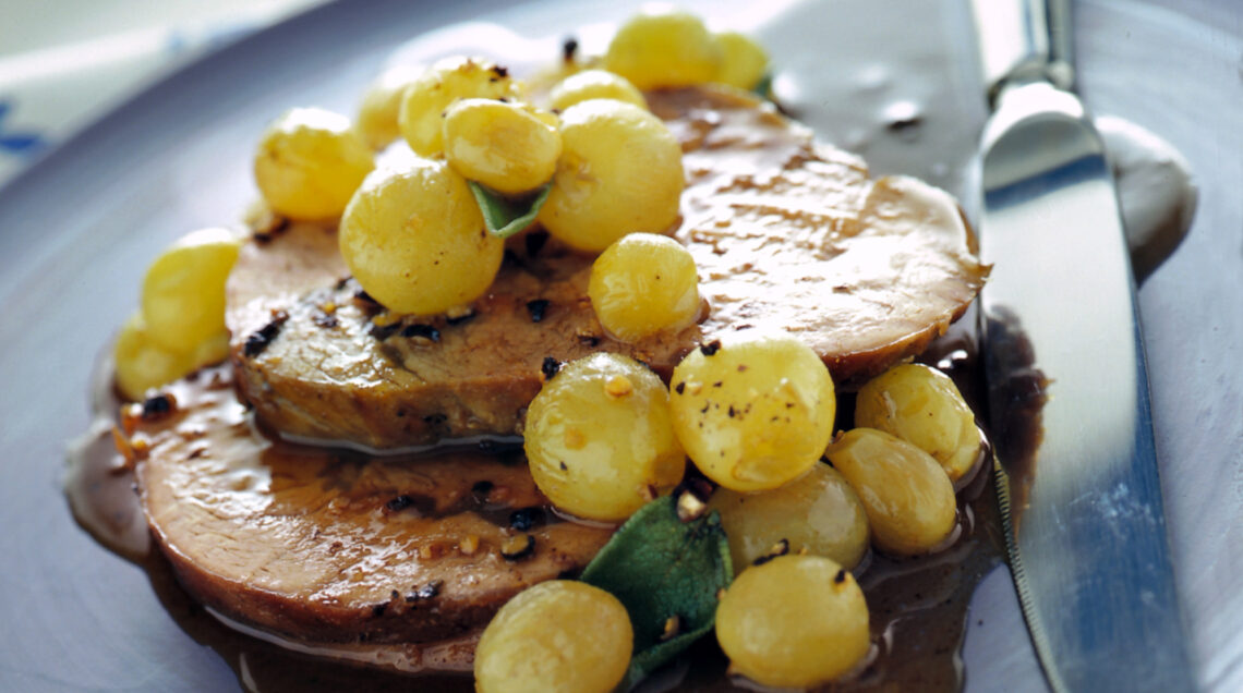 5 Negli ultimi 5-6 minuti di cottura, aggiungete l’uva rimasta. Quando l’arrosto è pronto, lasciatelo riposare per 5 minuti, poi affettatelo e servitelo con il suo sughetto.
