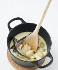 Pulite le verdure e l'aglio, dissalate le acciughe pulendole con un coltello e poi con carta da cucina (non lavatele e non togliete le lische), quindi tagliatele a pezzetti. Schiacciate gli spicchi d'aglio e metteteli in un tegame di coccio. Unite il latte e 20 g di burro e cuocete a fuoco lento finche l'aglio sarà sfatto. Aggiungete la acciughe, stemperatele nella purea d'aglio e poi passate il tutto al setaccio.
