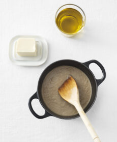 Mettete nuovamente il passato nel tegame, unite l'olio e il burro rimasto e proseguite la cottura a fiamma dolce per 5 minuti.