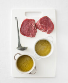Suddividete il composto in 4 tegamini, adagiate in ognuno una fetta di filetto e cuocete a fuoco vivo per pochi minuti (la carne deve restare rosata). Affettate le verdure e servitele con i tegamini di bagna cauda e il pane a fette.
