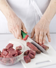 Tagliate la carne: per questo piatto utilizzate il filetto tagliato dalla parte della coda. Togliete la carne dal frigorifero un'ora prima di servirla, tagliatela a fette dello spessore di un paio di cm, poi a cubetti più o meno della stessa larghezza.