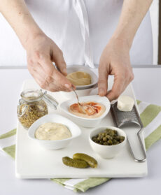 Riempite di maionese 4 piccole salsiere o ciotoline e aggiungete alla prima un cucchiaino di senape rustica, alla seconda un trito di cetriolini e capperi sott'aceto, alla terza una grattugiata di rafano, all'ultima un cucchiaino di salsa rubra e un cucchiaio di vodka; mescolate bene e sistemate le salsierine sulla tavola insieme alla carne disposta su un largo piatto.