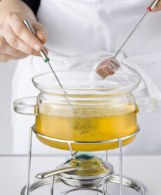Mettete al centro della tavola l'apposito fornelletto con sopra la pentolina piena per metà di olio d'oliva, scaldate bene l'olio, tuffatevi, uno alla volta, i cubetti di carne infilzati sulla forchettina, scolateli dopo pochi secondi e affondateli in una delle salsine.
