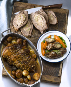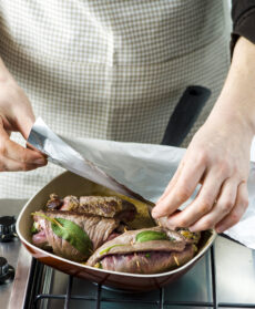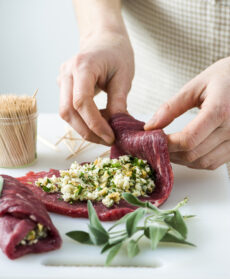 Ammorbidisci nel latte 2 manciate di mollica di pane, strizzala e mescolala con un trito di prezzemolo e aglio, una decina di nocciole tritate, 2 cucchiai di grana grattugiato, sale e pepe. Farcisci con il composto le fettine, forma gli involtini e chiudili con 2 stecchini su cui infilzerai una foglia di salvia.