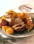 2) Cuoci l'arrosto. Rosola la carne farcita con un filo di olio extravergine di oliva, poi unite il mezzo spicchio d'aglio rimasto, la foglia d'alloro e il rosmarino; bagna con il brandy e fai sfumare a fuoco alto in modo che evapori la parte alcolica. Quindi trasferisci nel forno a 180° e cuoci per 40 minuti bagnando se serve con brodo di carne caldo.