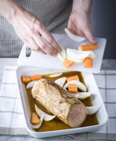 Rosolate un pezzo di magatello di 800 g in una padella con un filo di olio, salatelo, pepatelo e sfumatelo con un bicchiere di vino bianco; trasferitelo in una pirofila con il suo sugo, aggiungete 1 carota, 1 cipolla a pezzetti e 2 foglie di alloro, poi infornate a 190° per circa 1 ora.