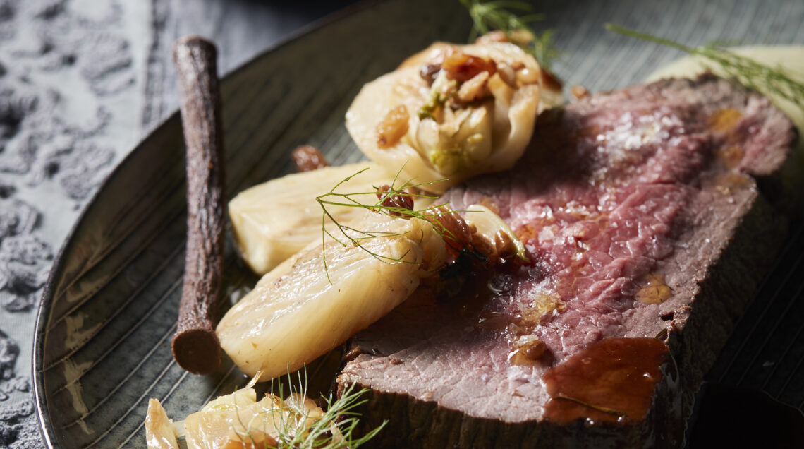 In questa ricetta dello chef Stefano Grandi, la fesa diventa un piatto che profuma di festa. Rosolata con un filo di olio per sigillare all'interno i sapori dei succhi, è stata marinata con olio, vino bianco, odori, erbe aromatiche e liquirizia, un gap armonioso con la dolcezza della carne. La cottura a diverse temperature, prima a 220°, poi a 180°, offre un arrosto roseo all'interno, tenero e succulento. Un piatto strutturato che si scioglie in bocca, affiancato dalla semplicità dei finocchi con uvetta e pinoli, teneri e cremosi. Un contorno di carattere senza rubare la scena alla sontuosità dell'arrosto.