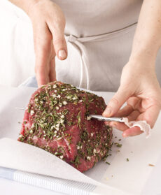 Per favorire una cottura uniforme della carne e mantenerla tenera, è bene legare con spago da cucina i pezzi di forma meno regolare e "ingrassare" i più magri, che possono