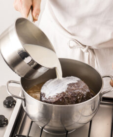 Bagnate l'arrosto prima con il vino e dopo un paio minuti con il latte, salate e unite l'alloro. Proseguite la cottura a fiamma bassissima per circa 2 ore a recipiente coperto. Lasciate riposare la carne per 10 minuti, quindi affettatela e servitela con il fondo di cottura passato al setaccio.
