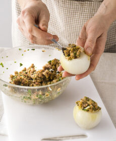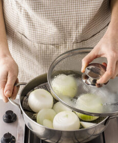 Per questa ricetta la cottura a vapore delle cipolle rende i bulbi teneri senza impregnarli di acqua. Se però volete lessarle, scolatele quando sono ancora sode e lasciatele asciugare capovolte su un telo.