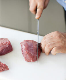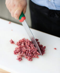 Battete il pezzo di scamone con un pesante coltello ben affilato, fino a ridurlo in minuscoli dadini.