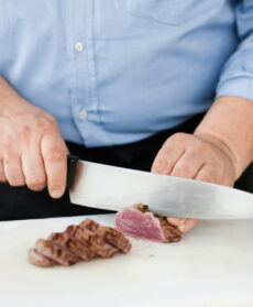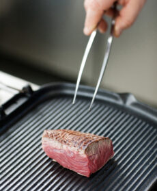 Pareggiate il pezzo di scamone rimasto in modo da dargli una forma regolare, scaldate bene una griglia e cuocetevi la carne 2-3 minuti per lato. Giratela senza pungerla, utilizzando le apposite molle: alla fine dovrà risultare cotta solo esternamente. Lasciatela riposare per qualche minuto, il tempo di lasciare che si ricompatti.
