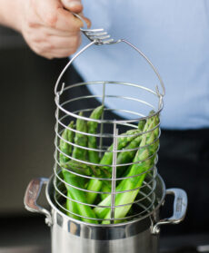 Pulite gli asparagi tagliando via il pezzo di gambo più duro e cuoceteli nell'apposita pentola con cestello piena per metà di
