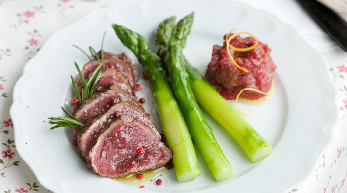 Un secondo raffinato ed elegante, preparato con carne pregiata. Gli asparagi appena lessati sono conditi con un filo d'olio e succo di limone
