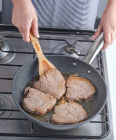 Salate e pepate le fette di carne. Fate spumeggiare 40 g di burro in una padella con l'aglio sbucciato e schiacciato, unite i filetti e cuoceteli a fiamma viva 1 minuto per lato. Prelevateli e disponeteli su un doppio foglio di carta da cucina. Deglassate il fondo di cottura con il Brandy, lasciatelo leggermente evaporare, eliminate l'aglio e spegnete.