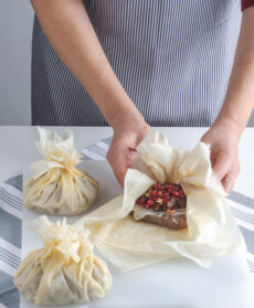 Sciogliete il burro rimasto a fuoco basso. Tagliate i fogli di pasta fillo in quadrati che possano contenere i filetti, spennellateli con il burro da un solo lato e impilateli a tre a tre. Disponete al centro la carne con la farcia e richiudeteli a fagotto pressando un poco nel punto di strozzatura. Trasferite i pacchetti su una teglia rivestita con carta da forno e infornateli a 180° per 20 minuti. Serviteli con il fondo di cottura caldo, a parte.