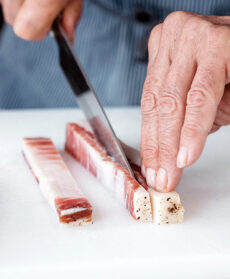 Rassodate 6 uova. Tagliate a bastoncini caciocavallo, provolone e lardo. Tritate il prezzemolo (tranne 4 rametti)