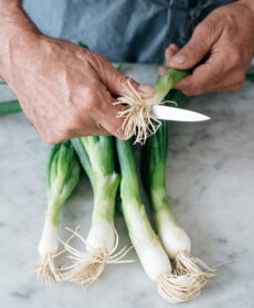 Pulite i cipollotti e tagliateli in quarti nel senso della lunghezza lasciando un po' di verde.