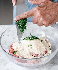 Riunite in una ciotola il vitello e il manzo, la salsiccia spellata e sbriciolata, il parmigiano, il pangrattato ammorbidito nel latte, il prezzemolo tritato, uno spicchio di aglio tritato e le uova rimaste (un uovo intero e un tuorlo). Impastate, salate leggermente e pepate.