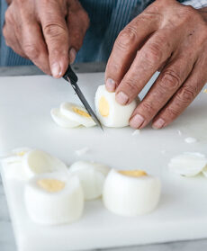 Sgusciate le uova sode mettendole in acqua e ghiaccio; tagliate via le due calotte fino a dove inizia il tuorlo. Stendete la fesa, ben battuta allo spessore di circa 1/2 cm e senza strappi.