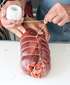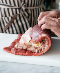 Battete leggermente la fetta di carne in modo che lo spessore sia omogeneo. Scegliete uova piccole, più adatte per un ripieno. Lardo e formaggi vanno tagliati a bastoncini spessi in modo che mantengano un po' di consistenza anche dopo la cottura. Avvolgete strettamente la fetta di carne sopra il ripieno e legatela bene in modo che la farcitura non esca durante la cottura. Cuocete il rotolo tenendolo costantemente bagnato in modo che la carne resti tenera e saporita. Preparato il giorno prima è ancora più buono.