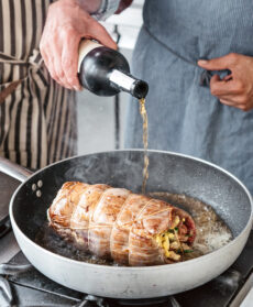 Chiudete molto bene legandola con spago da cucina. Scaldate in un tegame 4 cucchiai di olio e rosolate il falsomagro a fuoco vivace, finché è dorato da tutte le parti, poi toglietelo dal tegame e salatelo. Nel fondo di cottura fate rosolare la cipolla tritata. Quando accenna a dorarsi, aggiungete lo spicchio di aglio rimasto, intero e sbucciato, e l'alloro. Appena l'aglio incomincia a colorarsi, bagnate con il Marsala e fate evaporare.