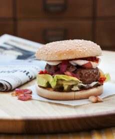 Spalma i panini tostati con la n’duia. Farciscili con l’insalata, gli hamburger, i dadini di cipolla caramellati, la bufala e il pomodoro affettati.