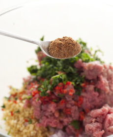 Disponete carne e bulgur in una ciotola e aggiungete la cipolla tritata finemente con il peperoncino (privato di semi e picciolo) e le foglie di menta tritate. Unite le spezie baharat, sale e 2 cucchiai di olio extravergine. Mescolate bene.