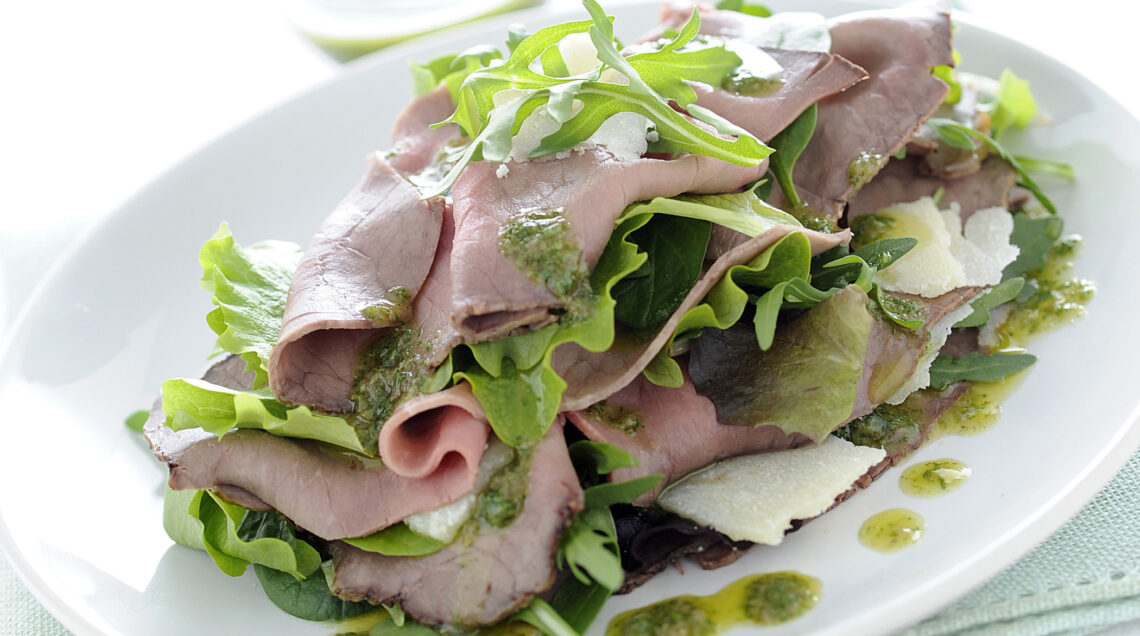 Tagliate metà parmigiano a lamelle sottili direttamente sull'insalata. Disponetevi sopra altre 2 fettine di roastbeef, poi ancora insalata e lamelle di parmigiano. Proseguite fino a esaurire gli ingredienti e servite subito.