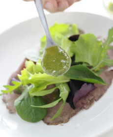 Lavate le insalatine e asciugatele. Disponete 2 fette di roastbeef in ogni piatto, accavallandole leggermente una sull'altra, e copritele con qualche foglia d'insalata. Condite con la salsa preparata.