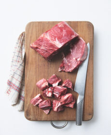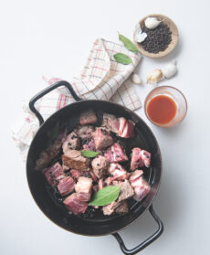 Cucinato in bianco, lo spezzatino di lonza, salsiccia e sedano rapa cremoso è reso audace dal Roquefort e profumato dalla salvia; più rustico lo spezzatino alla borgognona è arricchito con pancetta e lardo, cipolline e funghi.