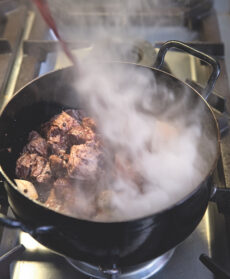 Coprite e proseguite la cottura in forno caldo a 180° per 2 ore e mezza circa. Controllate ogni tanto che il fondo non si asciughi troppo e, nel caso, bagnate con un mestolo di acqua calda. Prima di servire, profumate con una manciata di pepe. Se vi piace, accompagnate con polenta o verdure lessate saltate con burro e aglio.