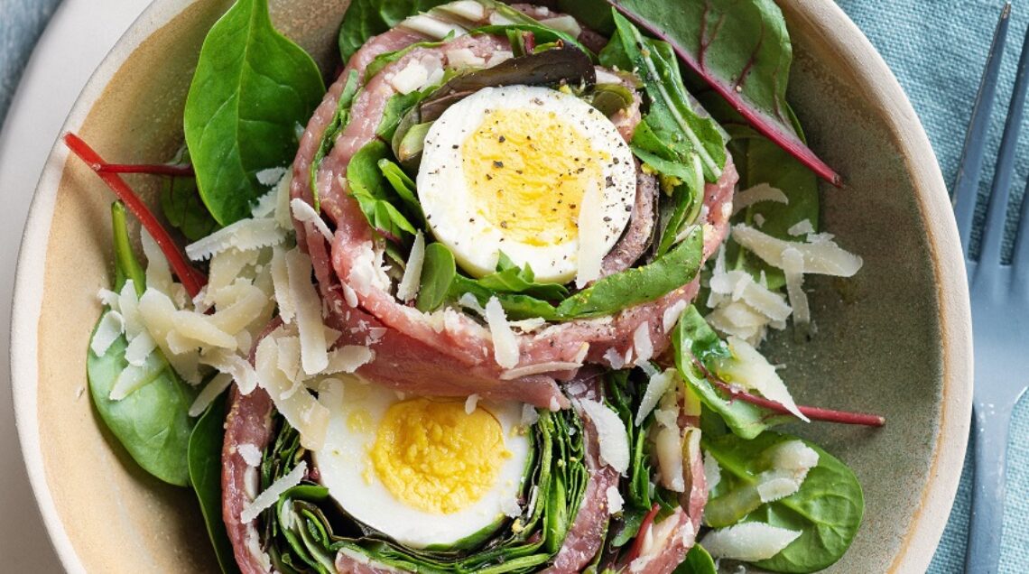 Ecco un modo diverso per portare in tavola il carpaccio di manzo. Con le fettine di carne cruda si realizza un insolito rollé con una farcitura ricca e fresca. Le cotture sono ridotte al minimo: solo una manciata di minuti per le uova sode e per addolicire l'aglio per la salsa. Anche per questo, il nostro rotolo è un piatto perfetto per l'estate!