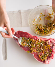 L'aceto balsamico, aggiunto in piccola quantità, porta acidità e una nota leggermente dolce che lega tutti gli altri elementi della marinata. Se cercate un altro grande classico estivo da proporre la nostra costata di scottona è servita con burro aromatico.