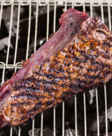 Costata di manzo marinata con scorze di agrumi, due pepi e aromi, grigliata al barbecue e servita con salsa cruda di pomodoro