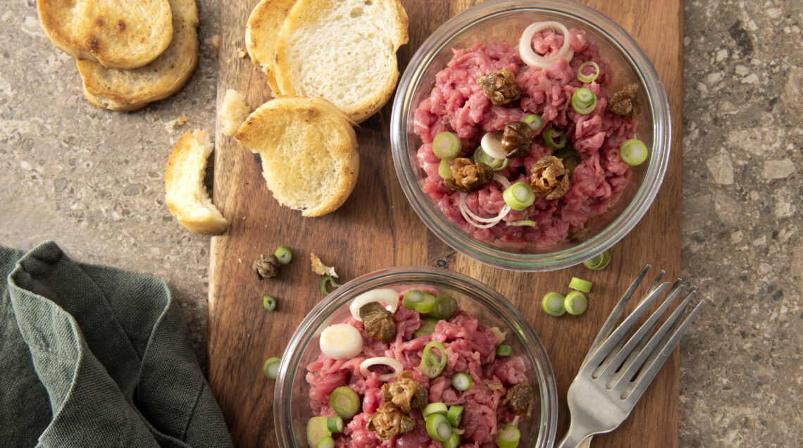 Tartare di punta d’anca al gin con capperi fritti