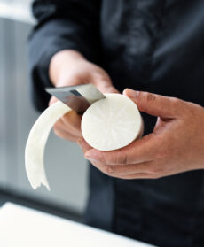 Fate riposare la carne per 15 minuti nella padella. Quindi tagliate il wagyu a fettine sottili, dello spessore di circa 3 mm.